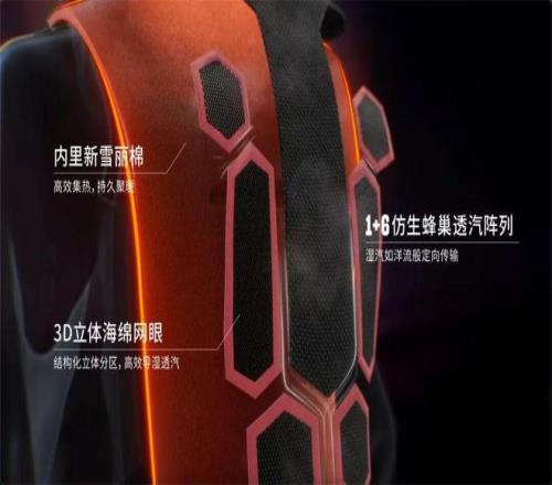 國家隊同源的熱力洋流3代科技,是幫助同步實現保溫與吸濕排汗的一套系統性解決方案。其機理在于獨特的蜂巢狀模塊化結構能使身體產生的熱量在服裝內循環流通,均勻分布,有效保持體溫;配合后背透氣窗與腋下拉鏈構建的“吸入-擴散-排出”濕熱管理閉環,又能使運動產生的汗濕蒸汽通過蜂窩通道被快速導出,達成吸濕排汗。